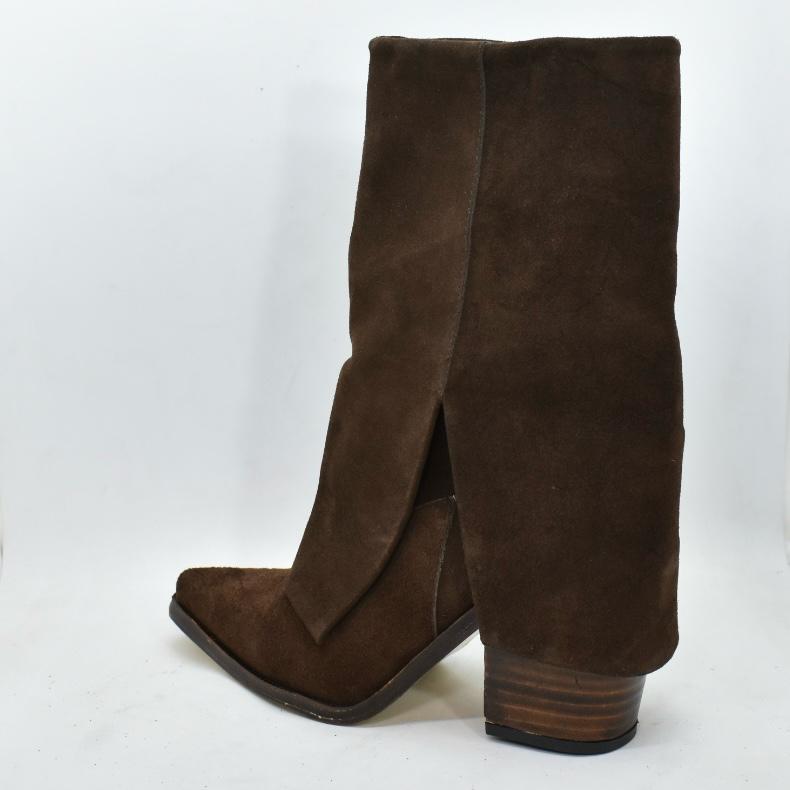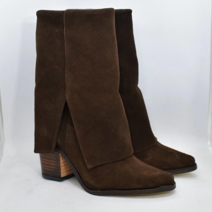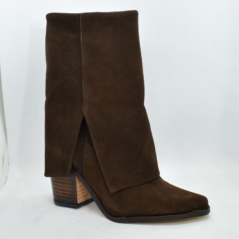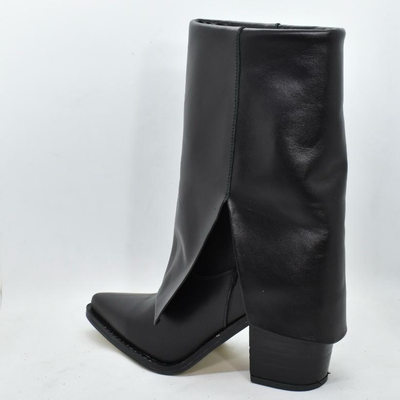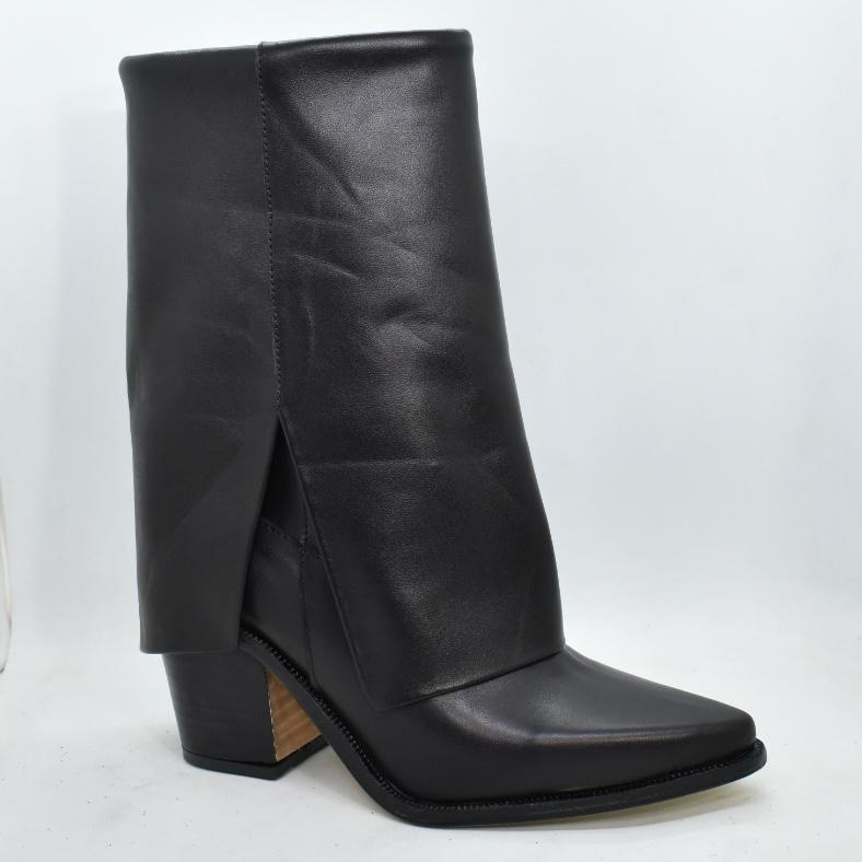 Bota de cuero caña media con faldón, diseño de punta fina y base suela con un taco de madera ancho de 8, 5 cm de alto. Un modelo versátil ideal para acompañar desde jeans y pantalones hasta vestidos, perfecto para la temporada de otoño-invierno. Marca ADESSO