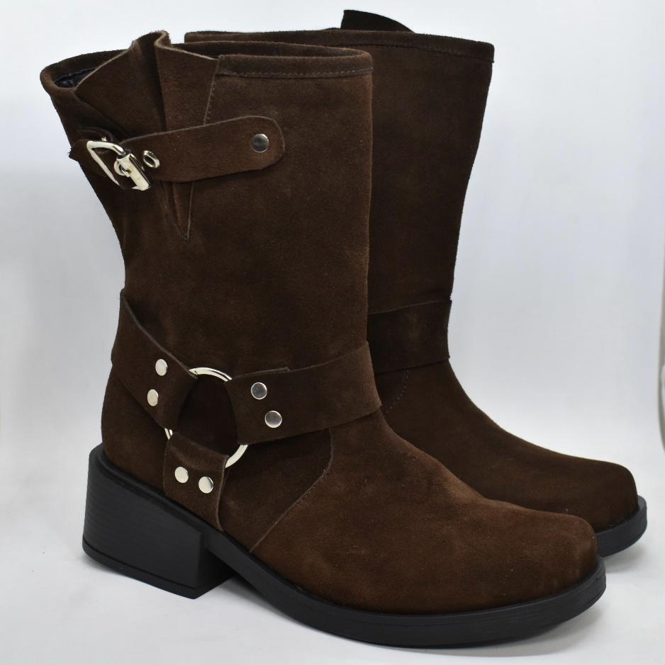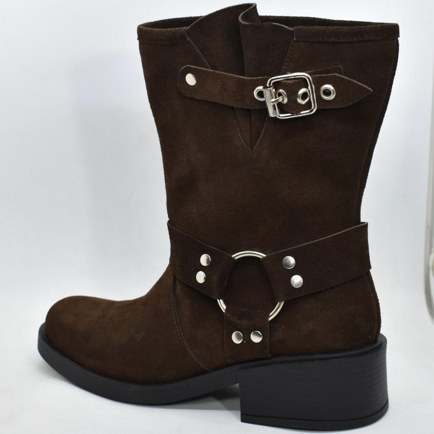 Bota de caña media confeccionada con material gamuzado, tiras con hebillas metálicas y aro central que le aportan un estilo moderno y con personalidad, base de goma y un taco de 5 cm de alto. ¡Un modelo con actitud que eleva cualquier outfit de temporada! Marca ADESSO