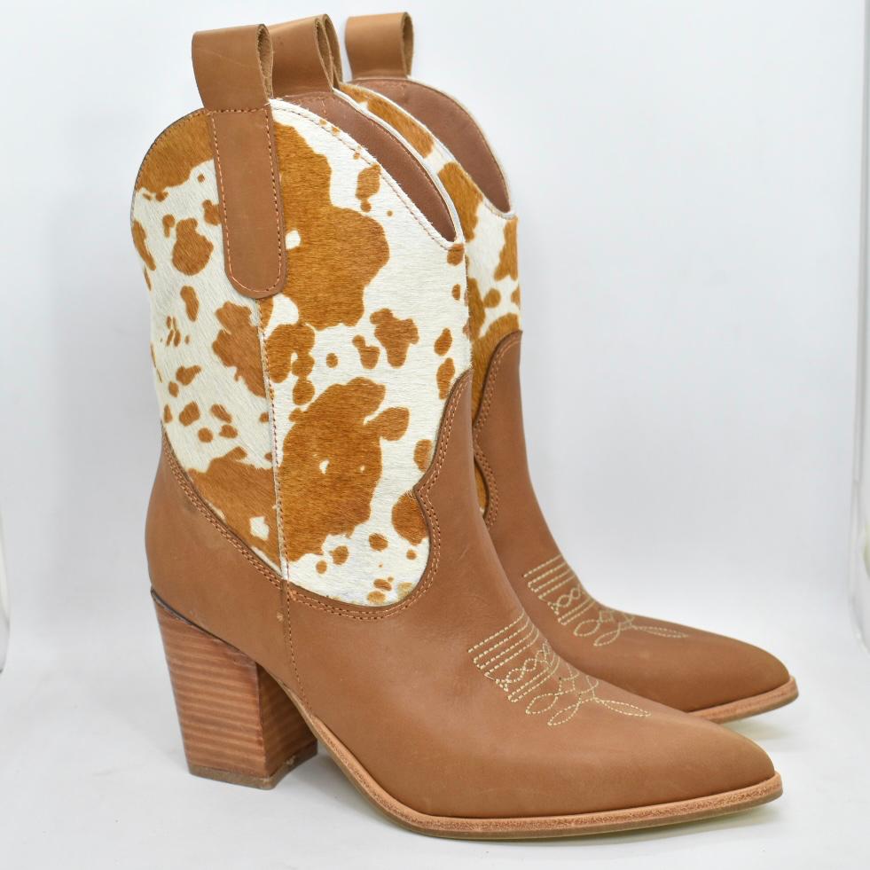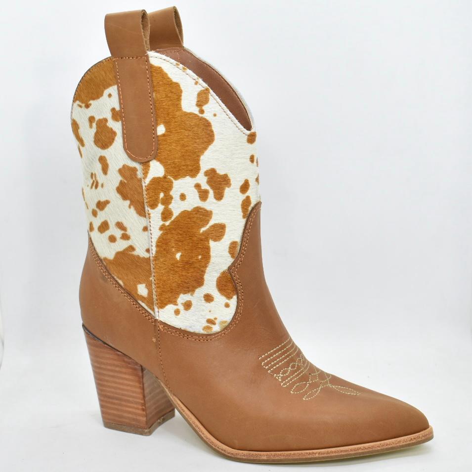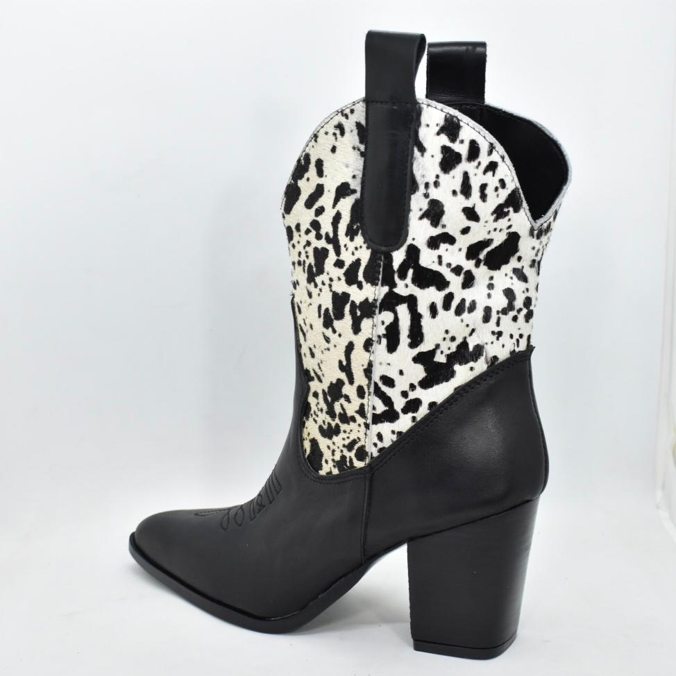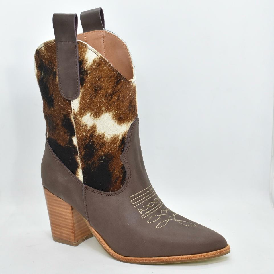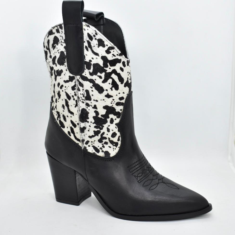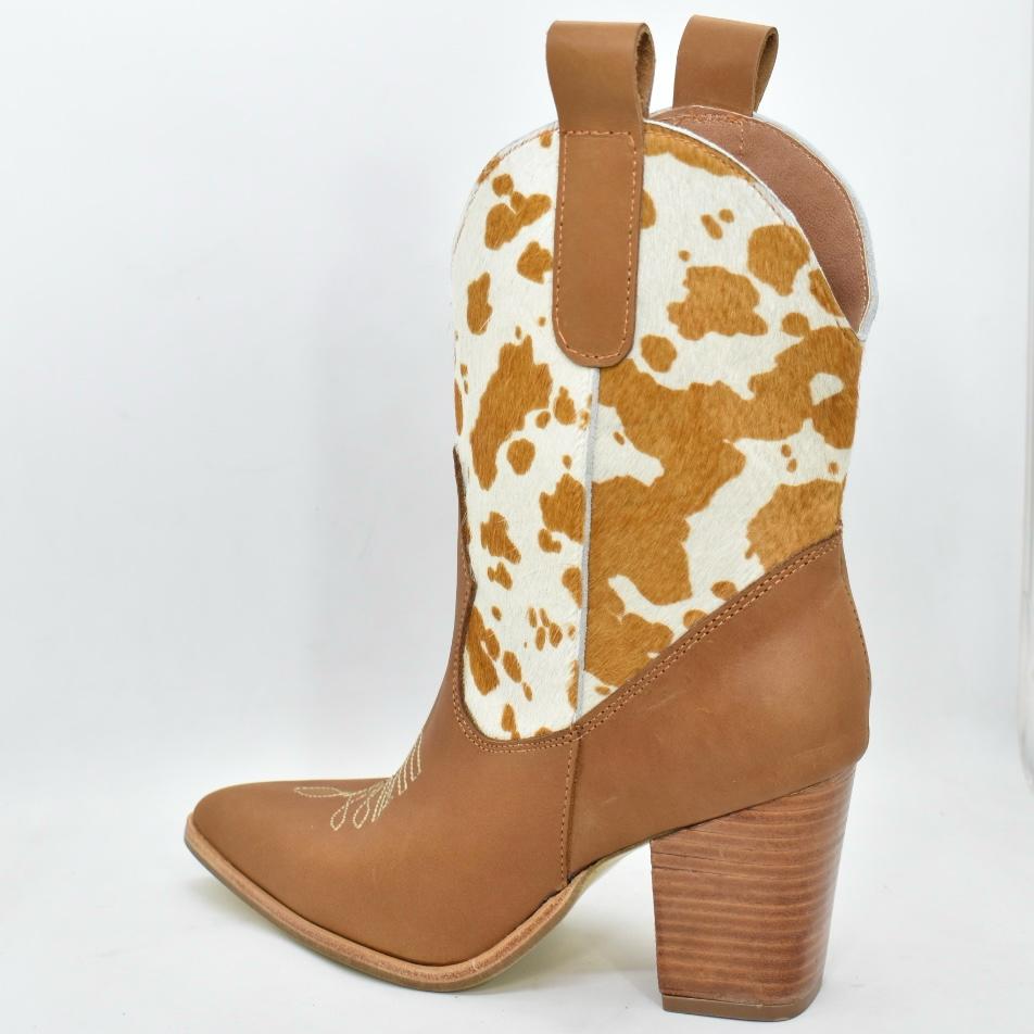 Bota texana caña media, combinada cuero con pelo sintético símil vaca. Horma en punta con bordado en capellada. Base de suela con taco folia de 10cm. Una bota que no te puede faltar este 2025! Marca: MAJAZ SHOES