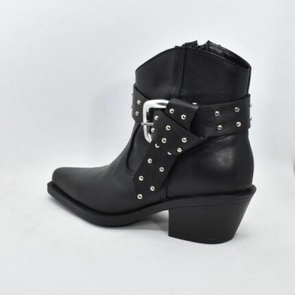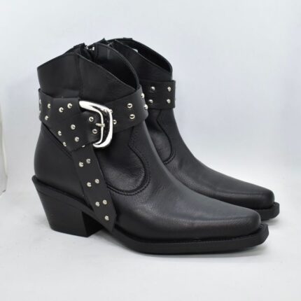 Bota texana de cuero con faldón liso, detalle de candado metálico, punta fina y base de suela con un taco de 6 cm de alto. Ideales para levantar cualquier look!