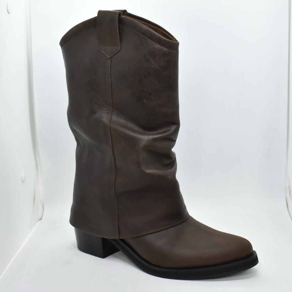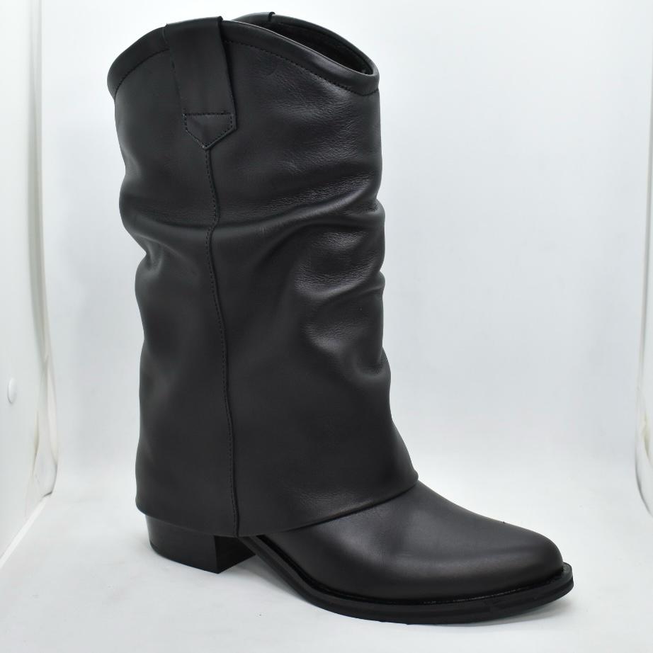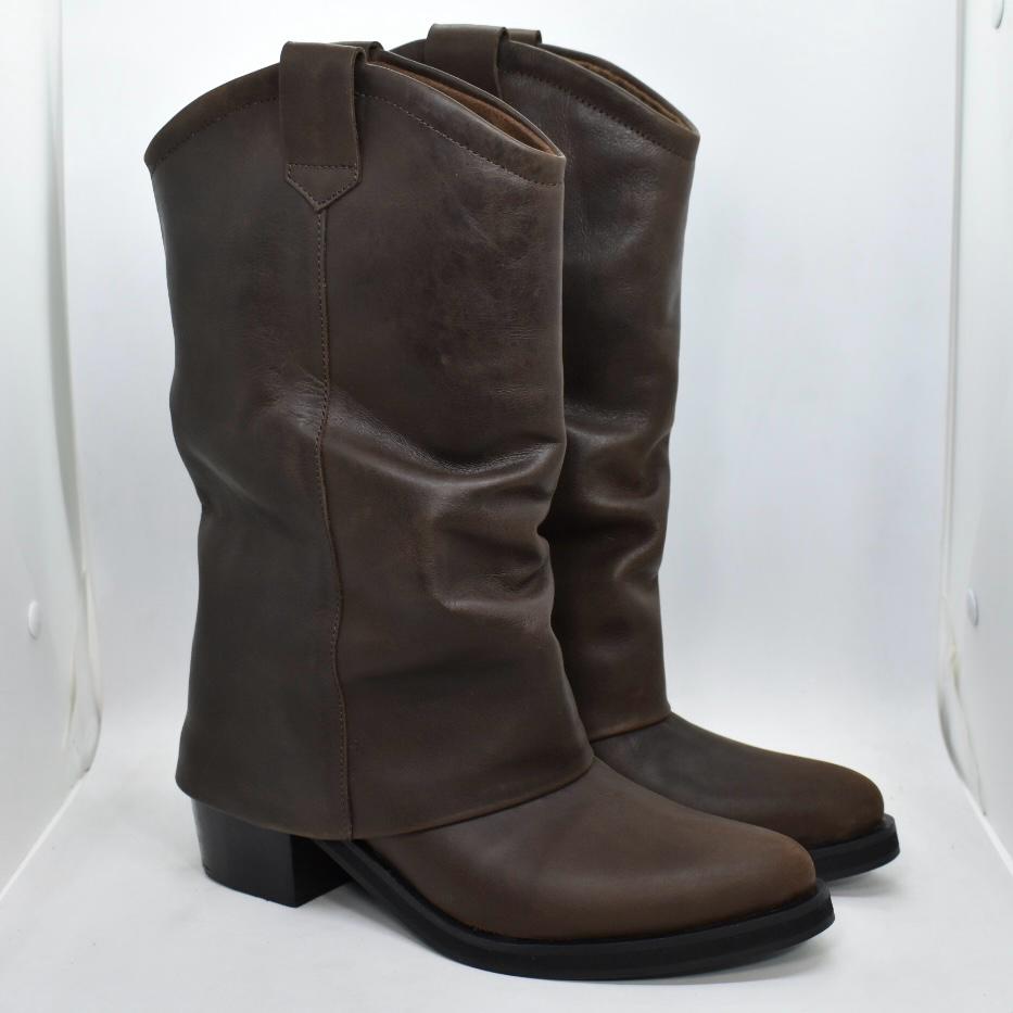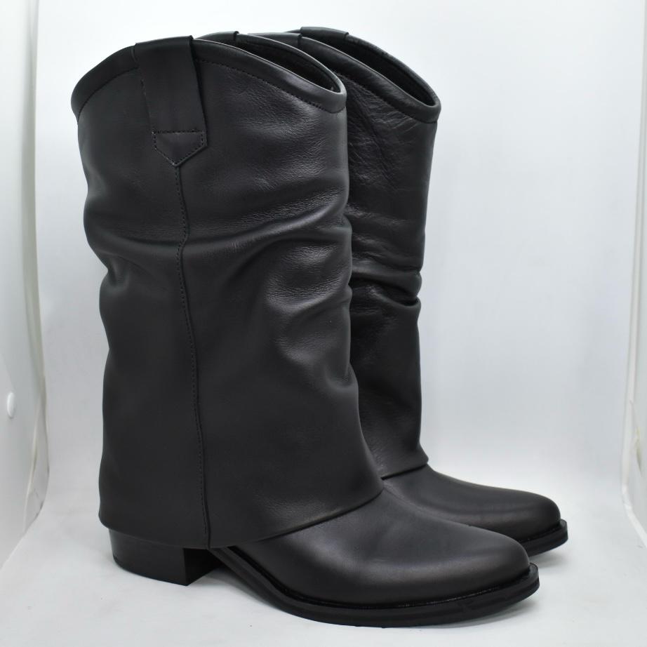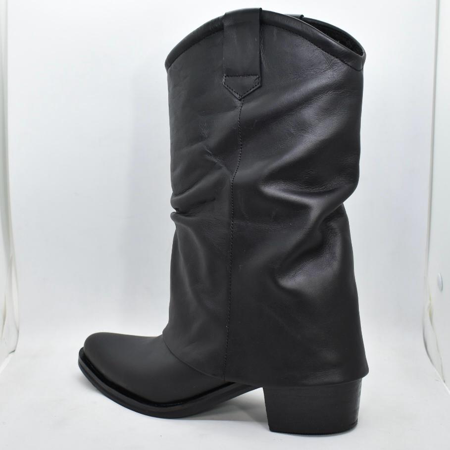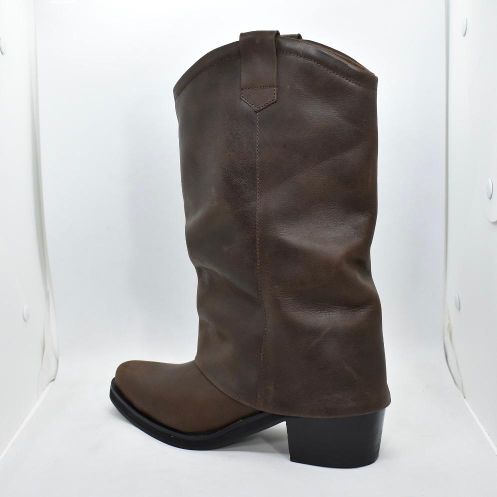 Bota estilo texano de cuero, cuenta con una caña volcada amplia, base de suela con punta levemente redondeada y taco de 6, 5 cm de alto. Ideal para sumar un toque canchero a tus looks de temporada. Marca CANELA