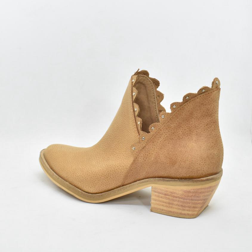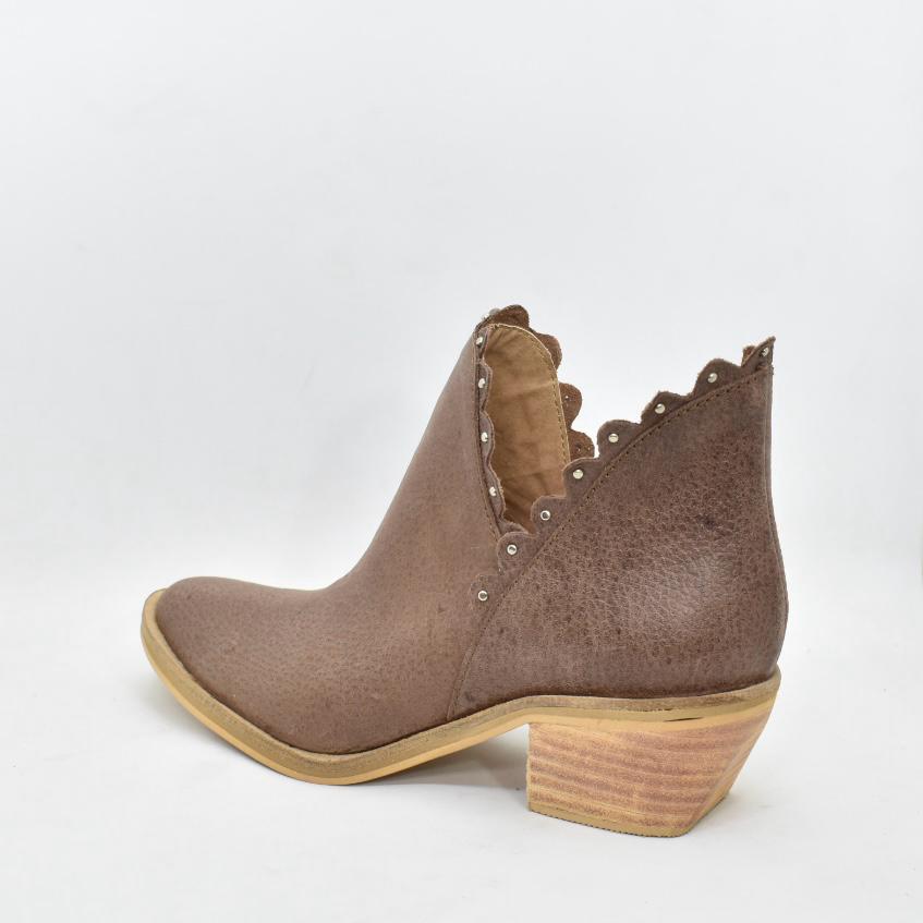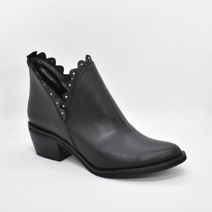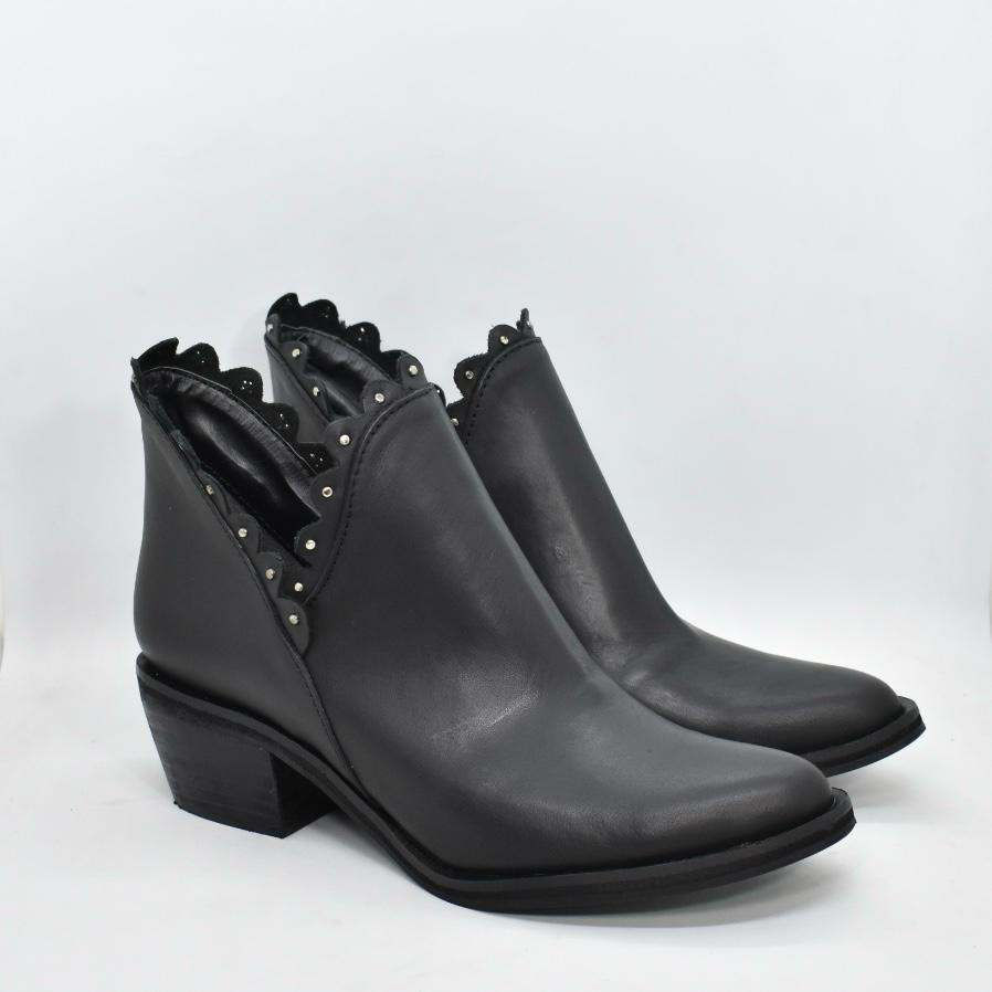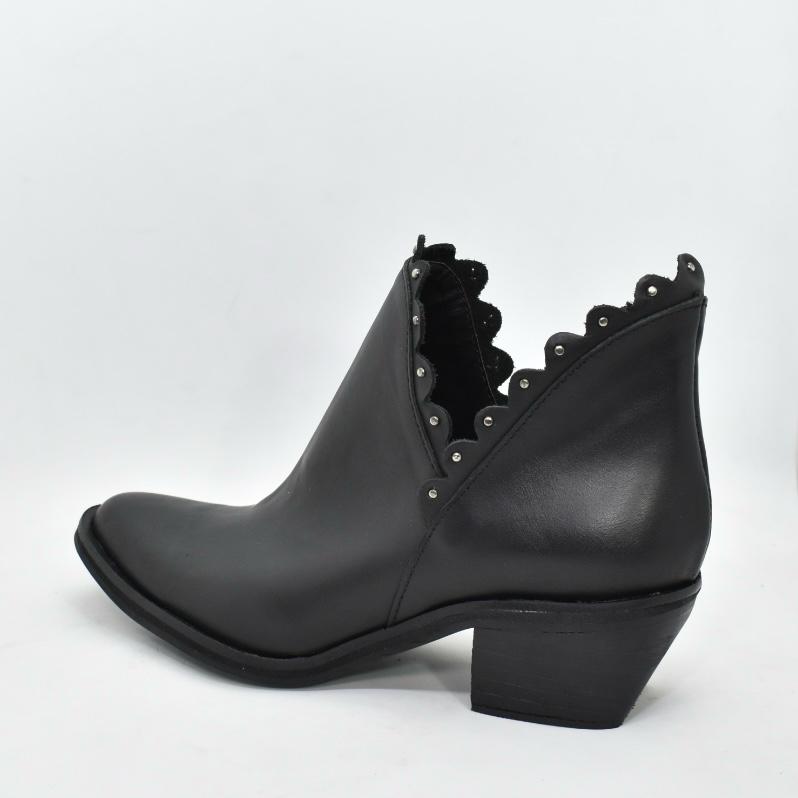 Botineta de cuero abierta a los lados, con detalle de volados con mini tachas. Horma en punta con taco folia de 5cm. Se destaca por ser versátiles y cómodas! Marca: DI MAIO
