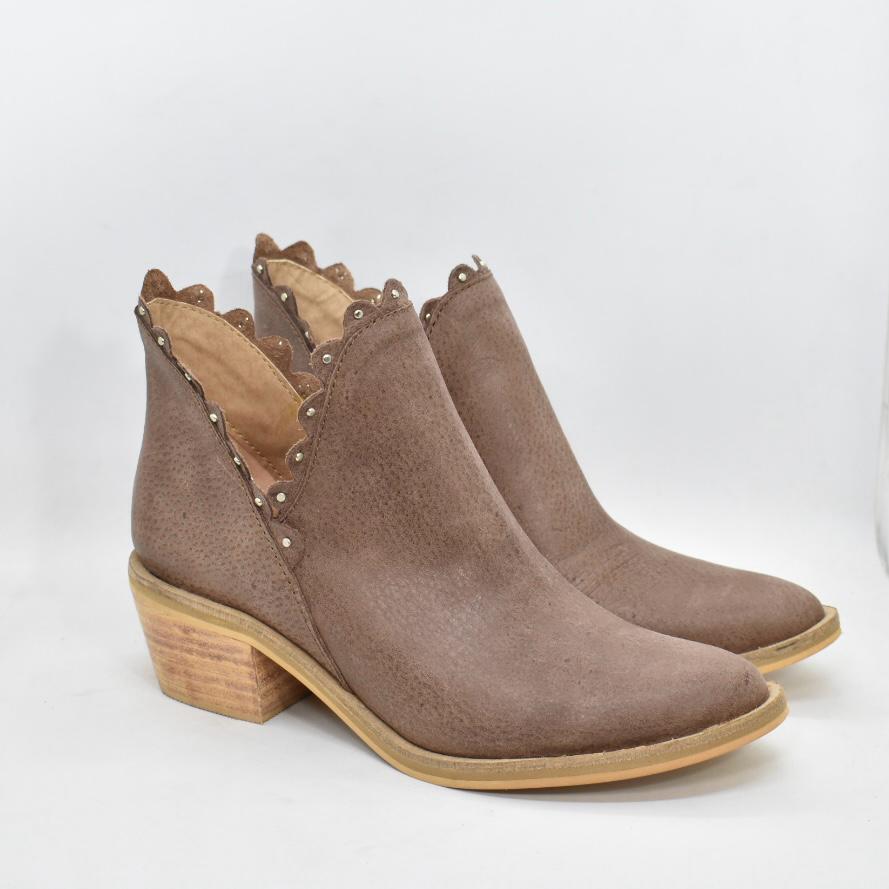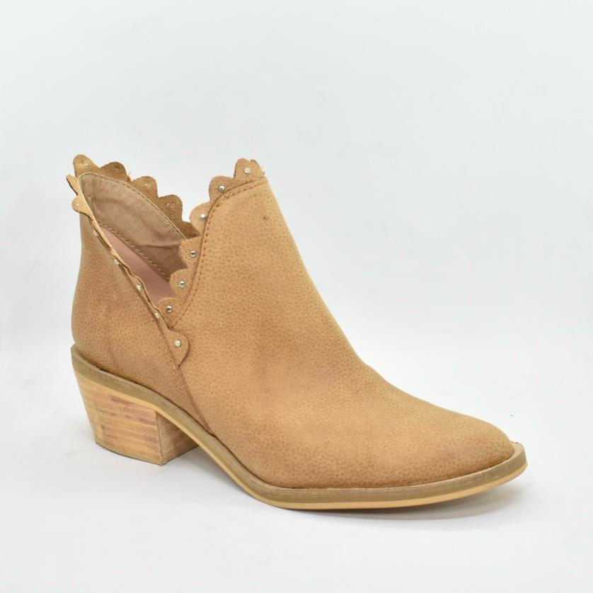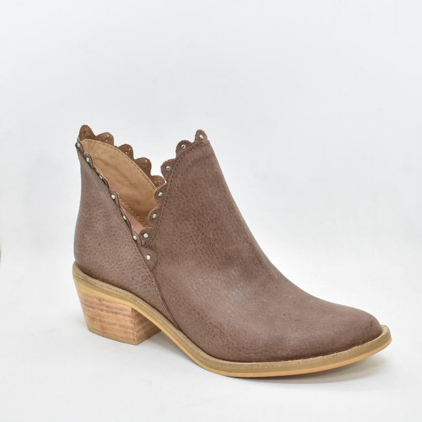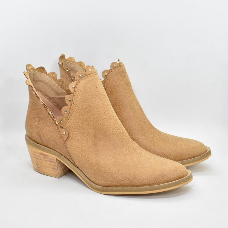Botineta de cuero abierta a los lados, con detalle de volados con mini tachas. Horma en punta con taco folia de 5cm. Se destaca por ser versátiles y cómodas! Marca: DI MAIO