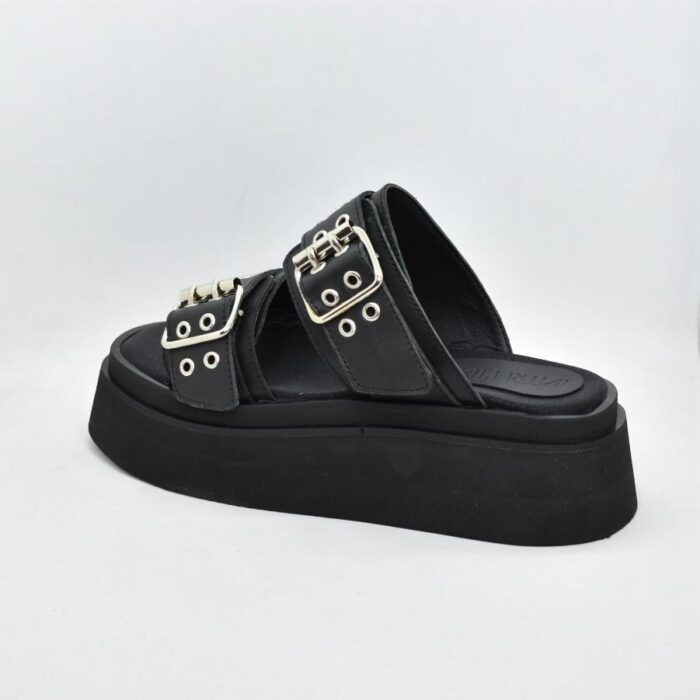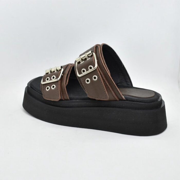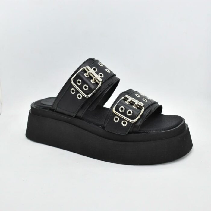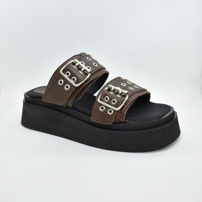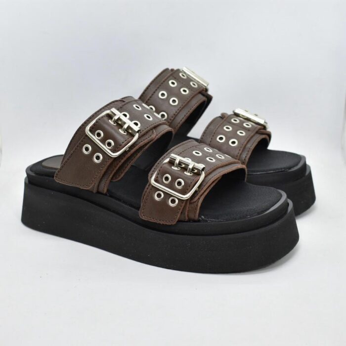 Sandalia de cuero con tiras anchas y hebillas metálicas ajustables, diseño de ojales decorativos, y una plataforma de goma eva de 5 cm de alto. ¡Perfectas para usar con tus looks urbanos! Marca INTREPIDAS