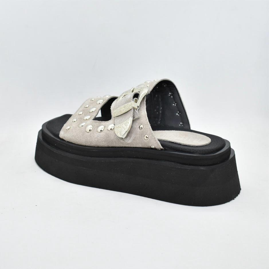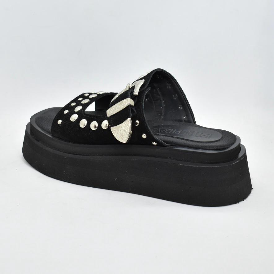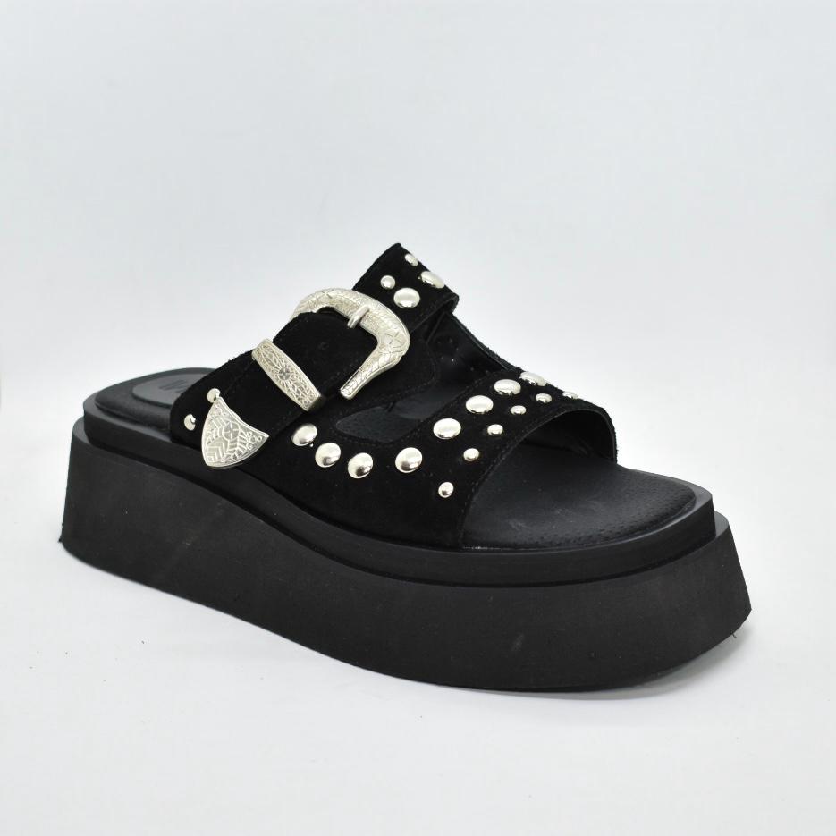 Sandalia de gamuza, con tachas y hebilla regulable, base de goma de 3cm de alto. ¡Ideales para tus looks de este verano! Marca INTREPIDAS.