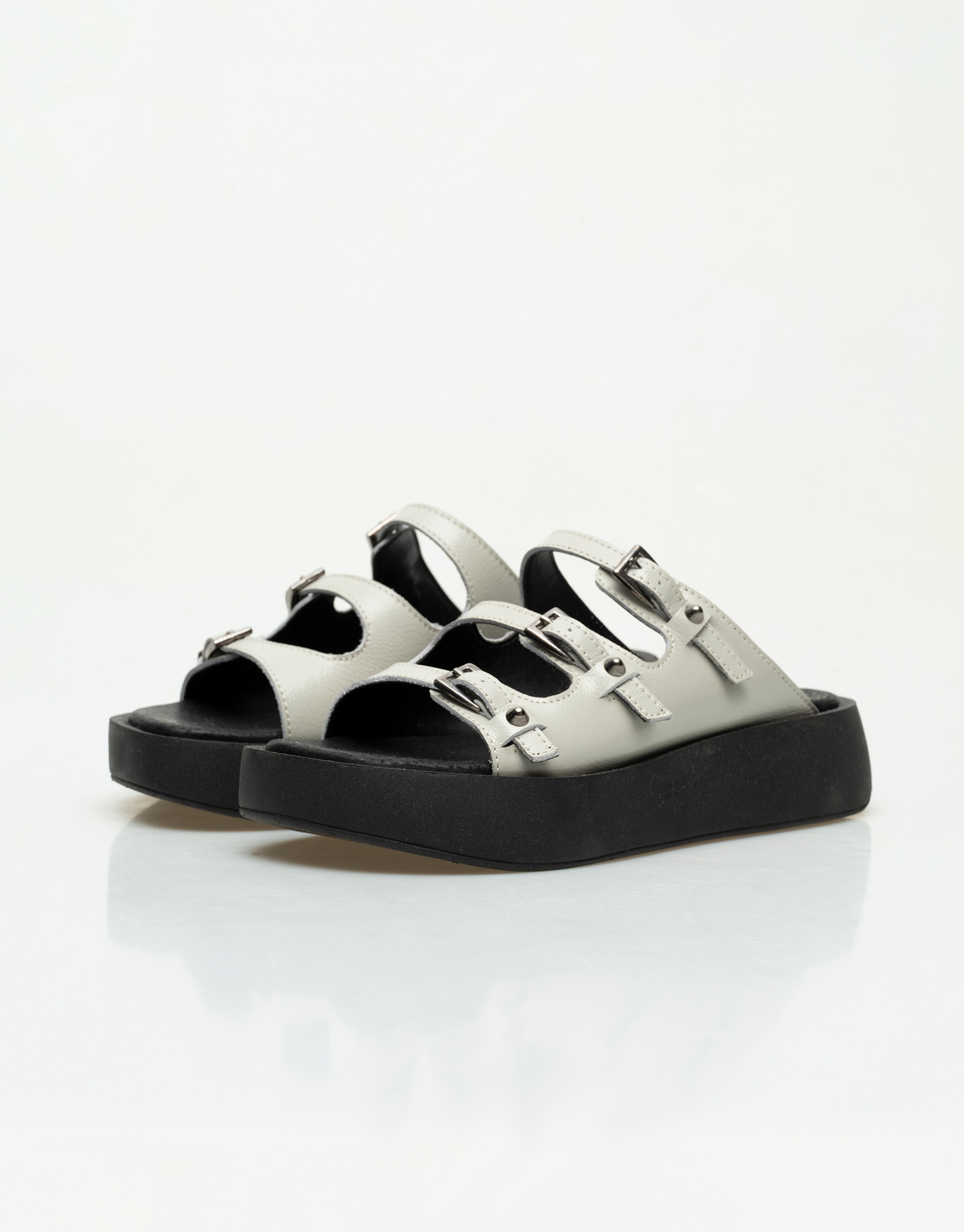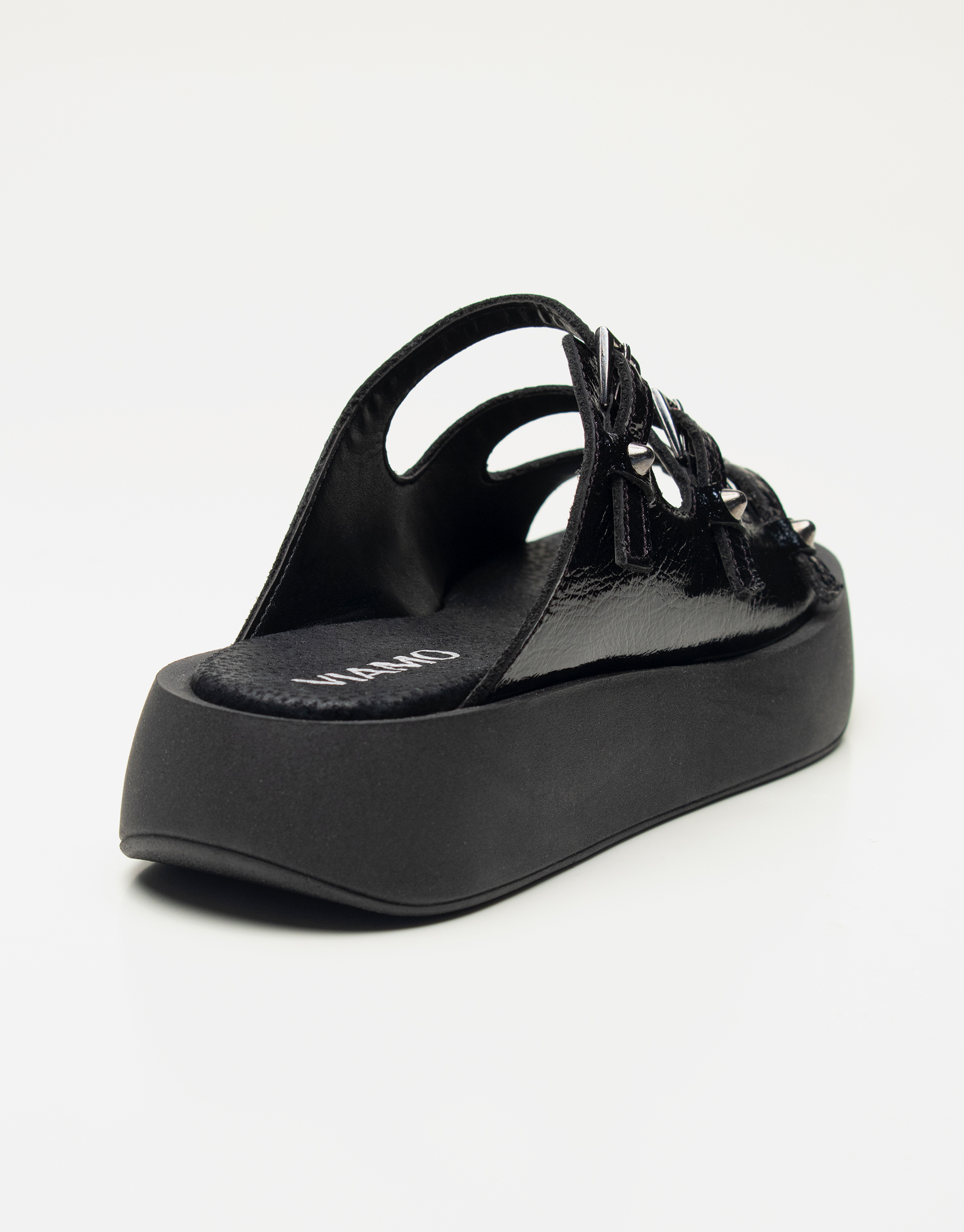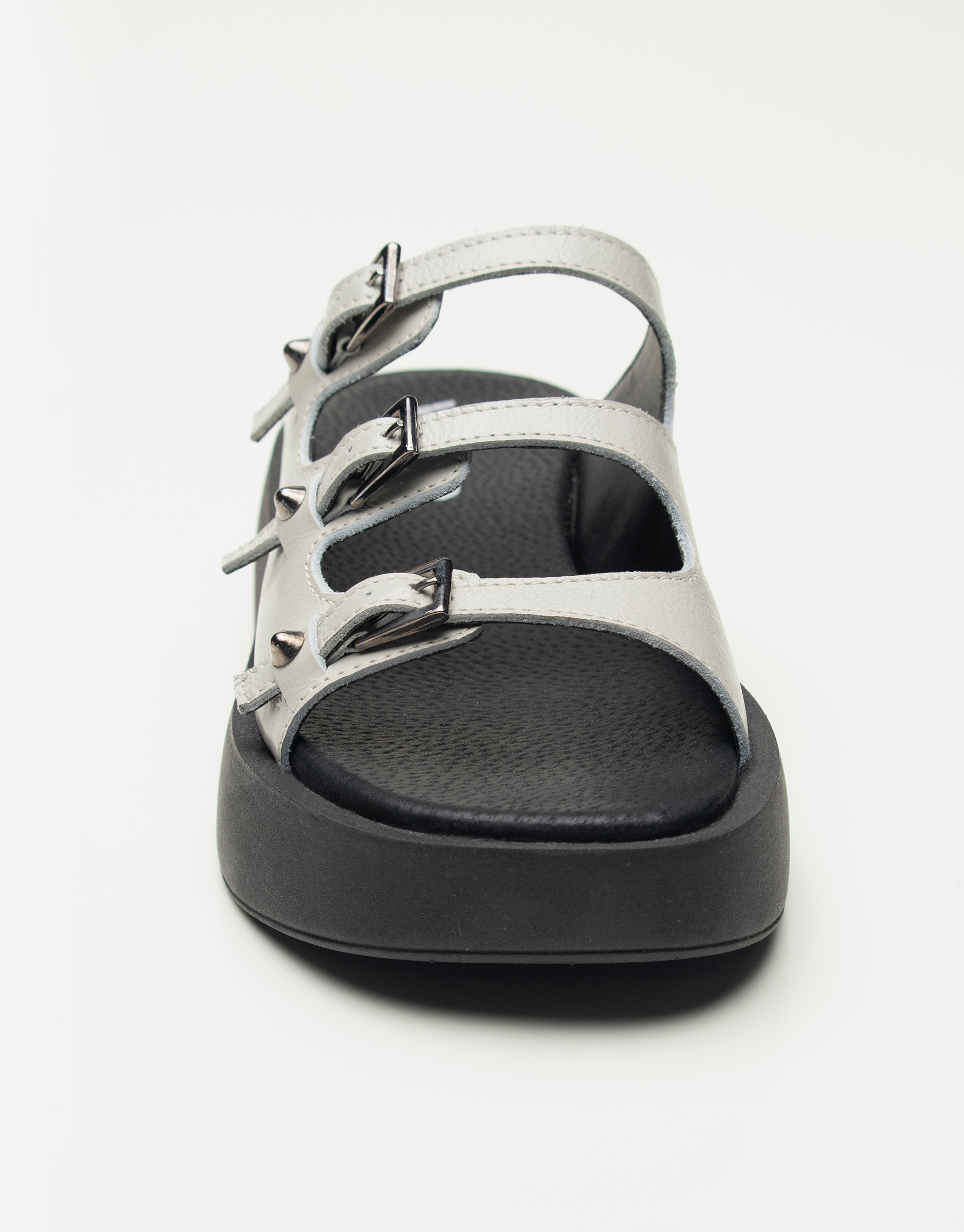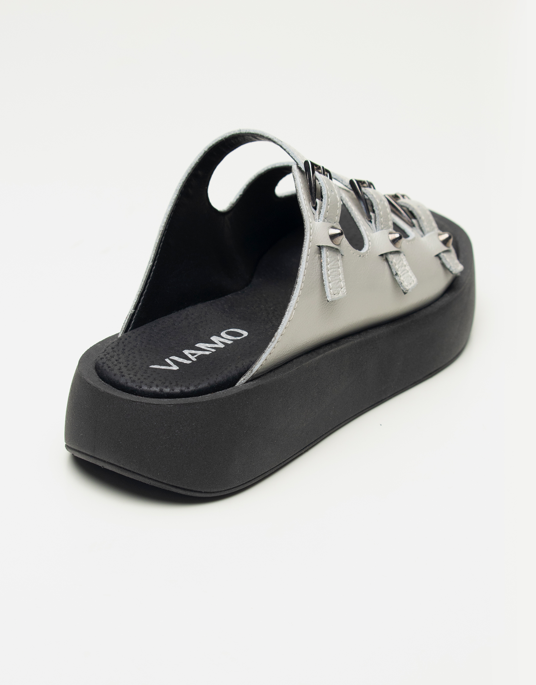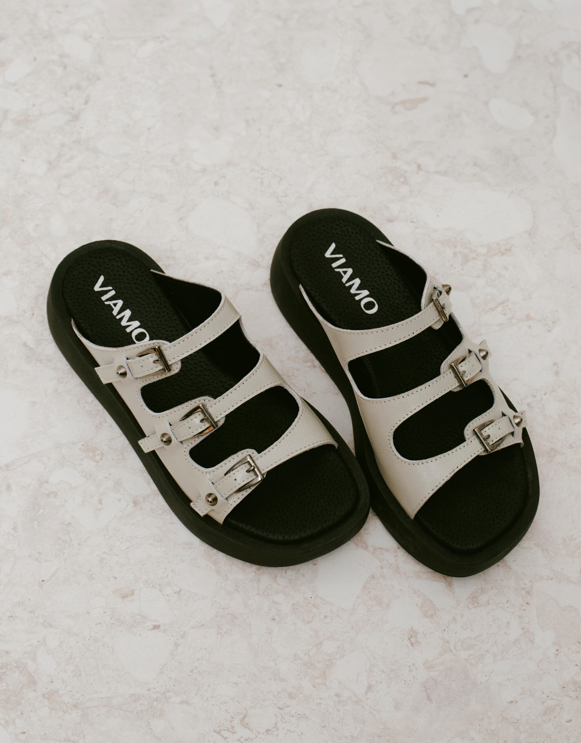 Sandalia de cuero con detalle de 3 hebillas , capellada envolvente pero con la delicadeza de la tira que cruza por el empeine , tiras regulables con tachas conicas , base de goma de 4cm , son livianas y tinen una horma cuadrada y standar. Marca Viamo