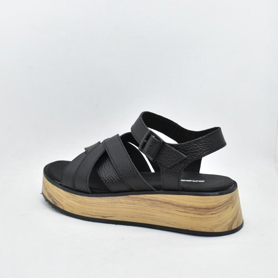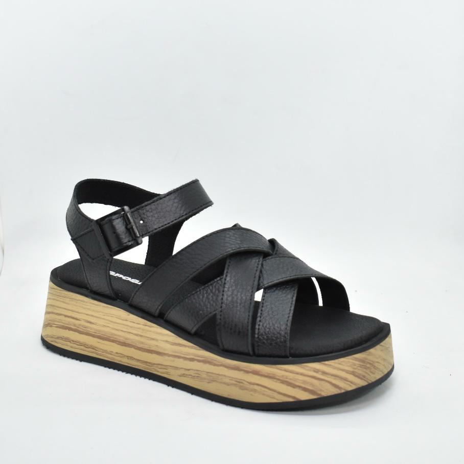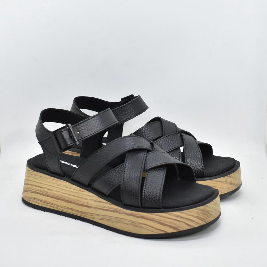 Sandalia de cuero tiras entrelazadas cruzadas, con pulsera regulable al tobillo, y punta cuadrada. Base entera de goma símil madera de 5cm. Súper livianas y cómodas, ideales para usar a diario en verano! Marca: SPOSAMI