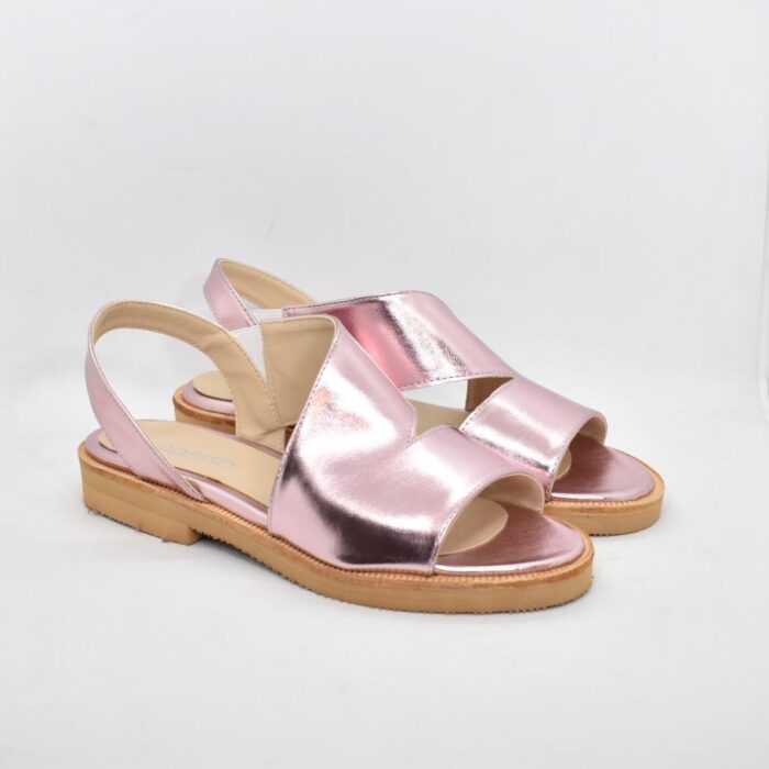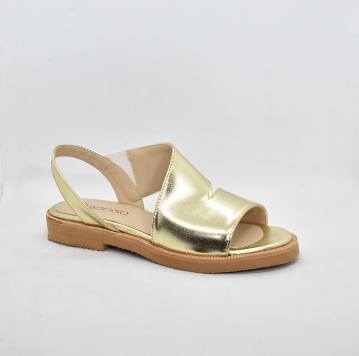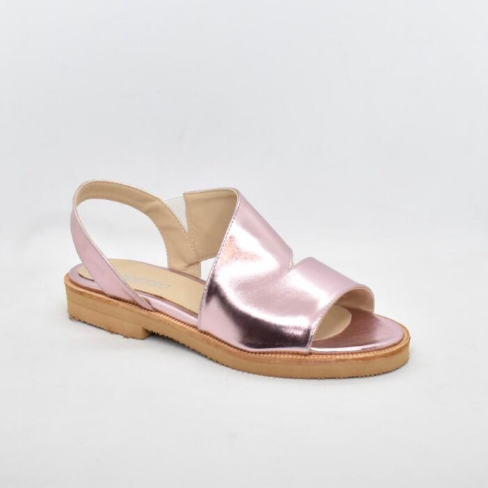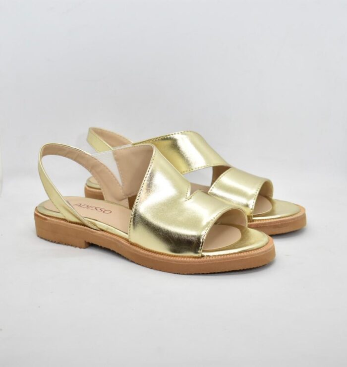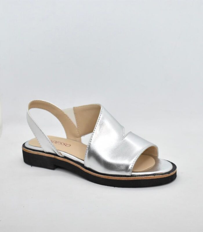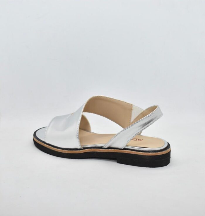 Sandalia de PU con medio enfranque, puntera y talon descubierto. Capellada lisa metalizada y con base de goma. Marca Adeso