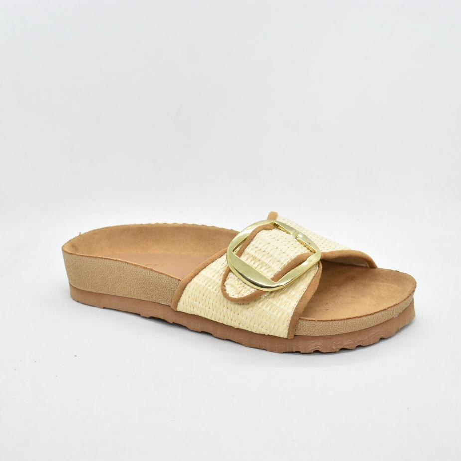 Sandalia birk con faja de rafia y hebilla dorada regulable. Plantilla anatómica gamuzada de 3.5cm. Un modelo cómodo, fresco y súper en tendencia esta temporada de verano! Marca: BRUNO MANETTI