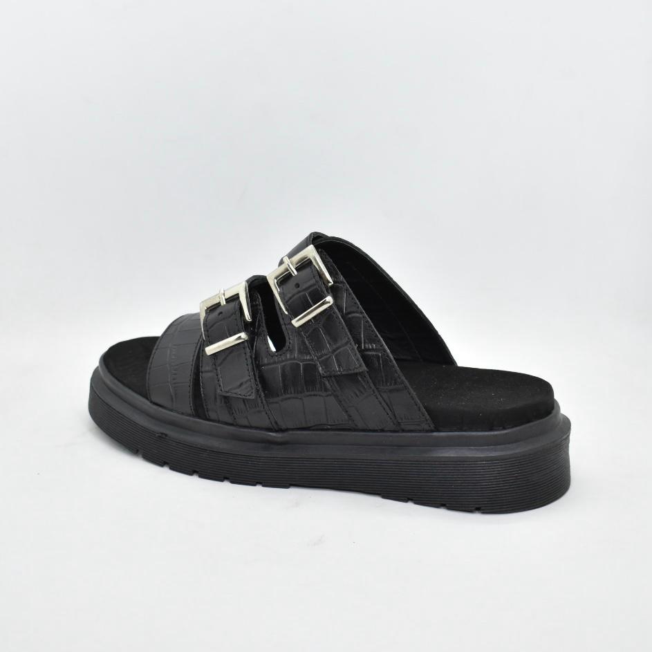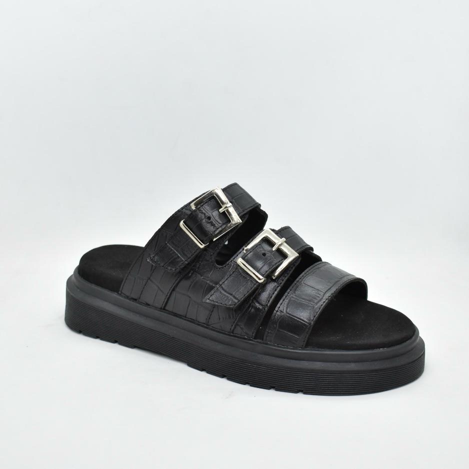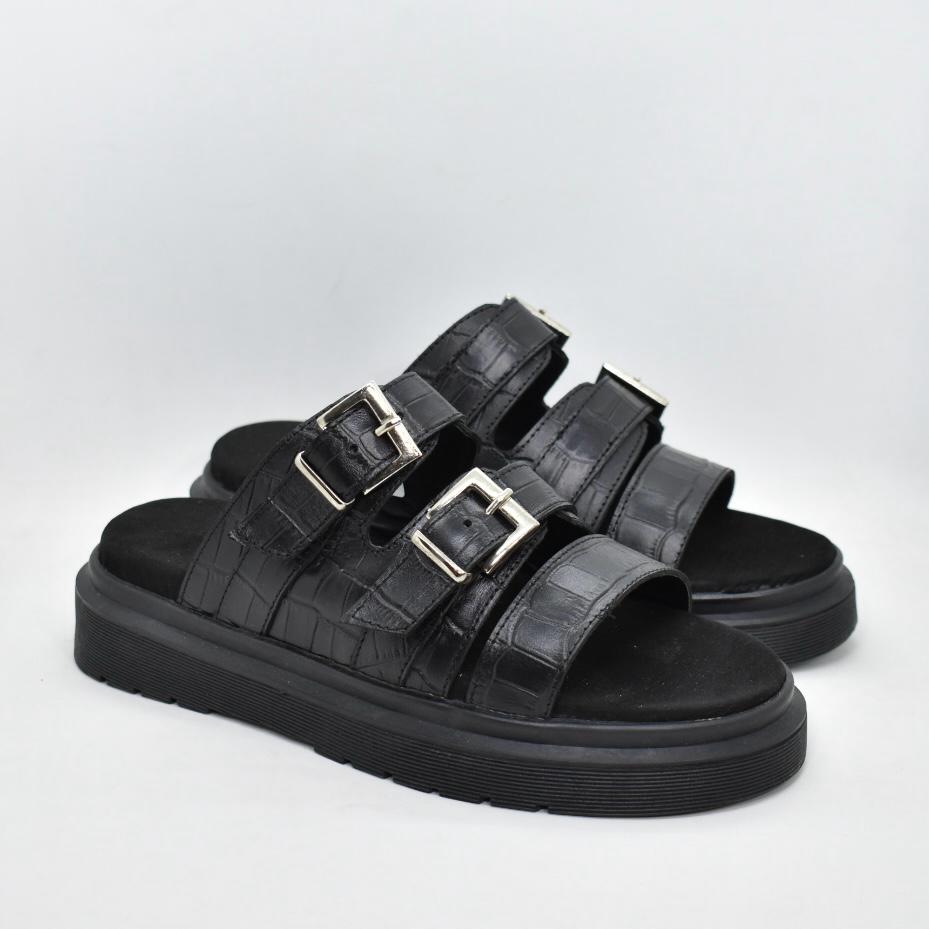 Sueco birk de cuero croco, con 2 hebillas y 3 tiras, plantilla gamuzada y base de goma de 4 cm de alto, es un modelo ideal para darle un toque a un outfit clásico! Marca INTREPIDAS