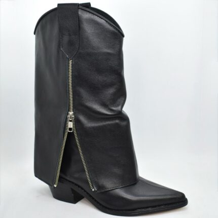 Texana de cuero vacuno, caña larga de 30 cm aprox con dibujo bordado. Punta fina, taco revestido en folia con una altura de 6 cm. Marca Adesso