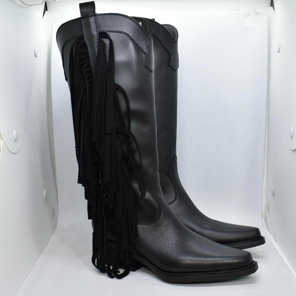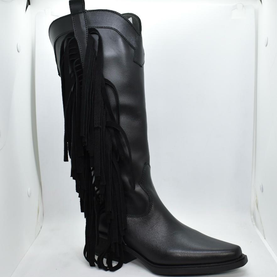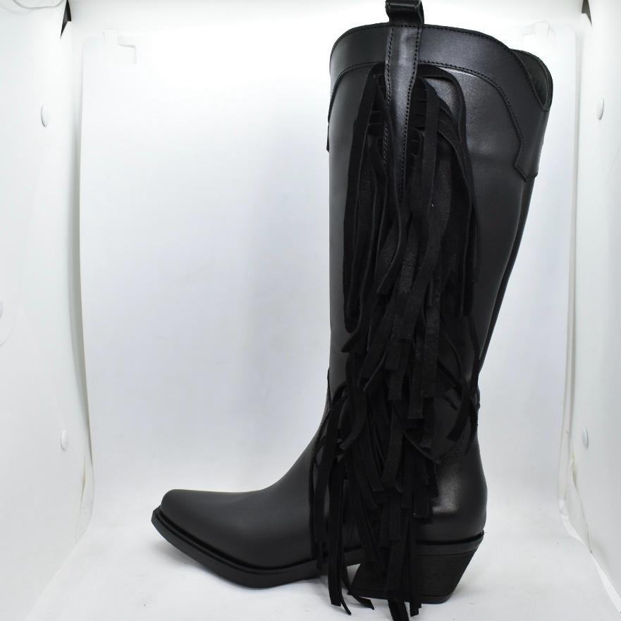 Texana de cuero, caña media, con flecos en lateral externo y cierre interno. Horma en punta, con base de goma de 1.5cm y taco de 5cm. Un modelo clásico, súper cómodo para todo momento! Marca: INTREPIDAS
