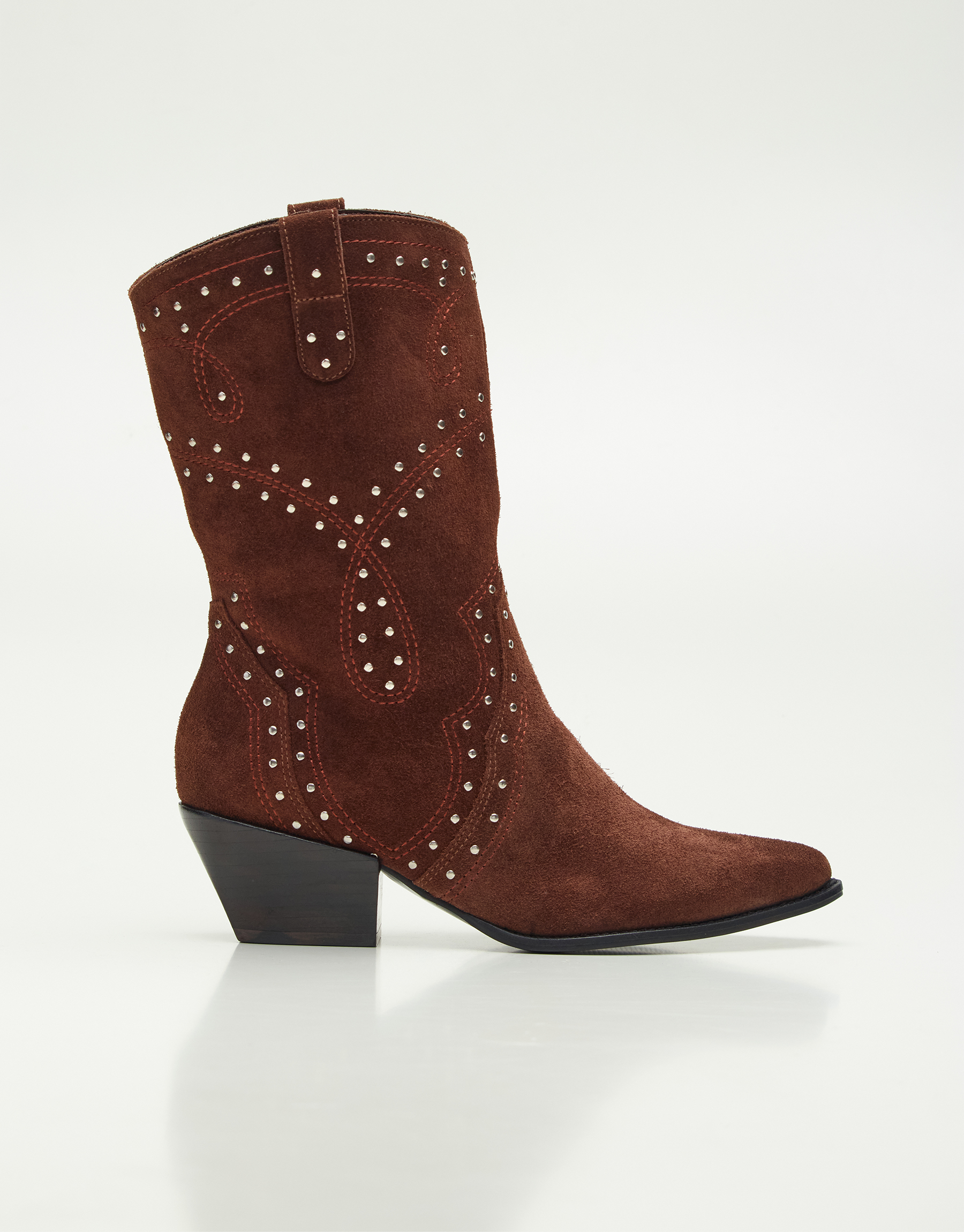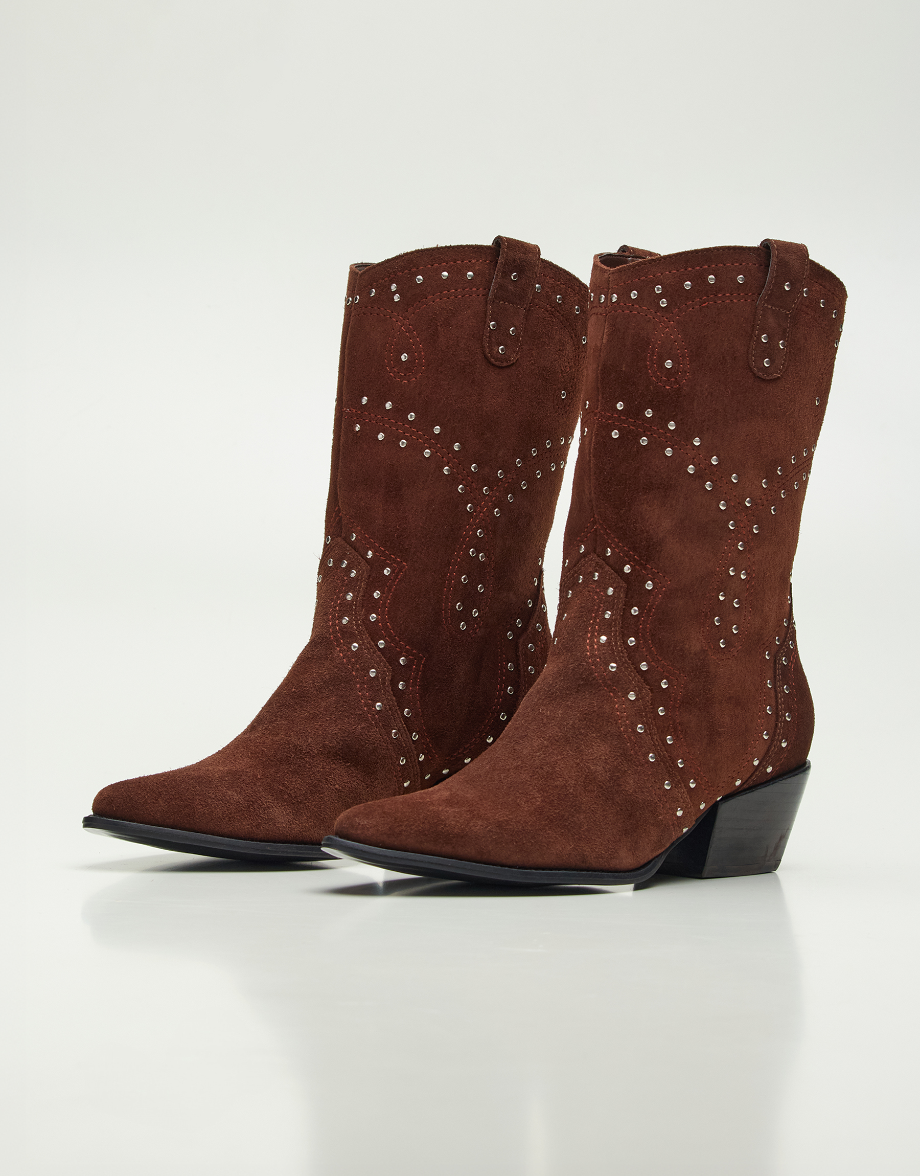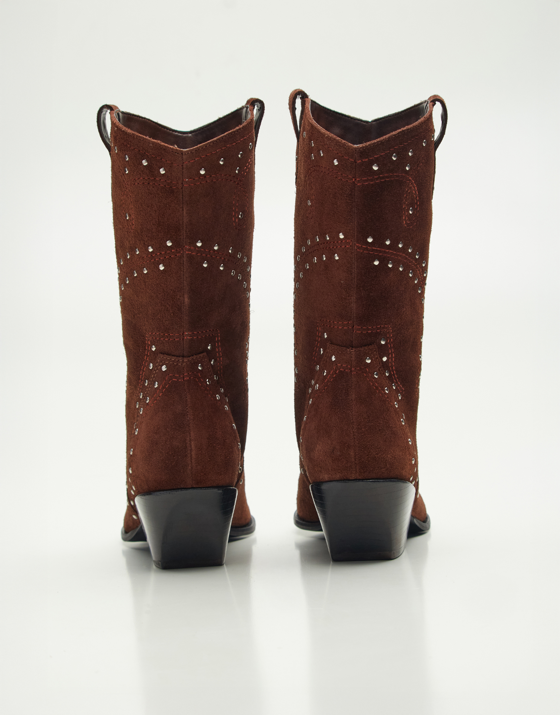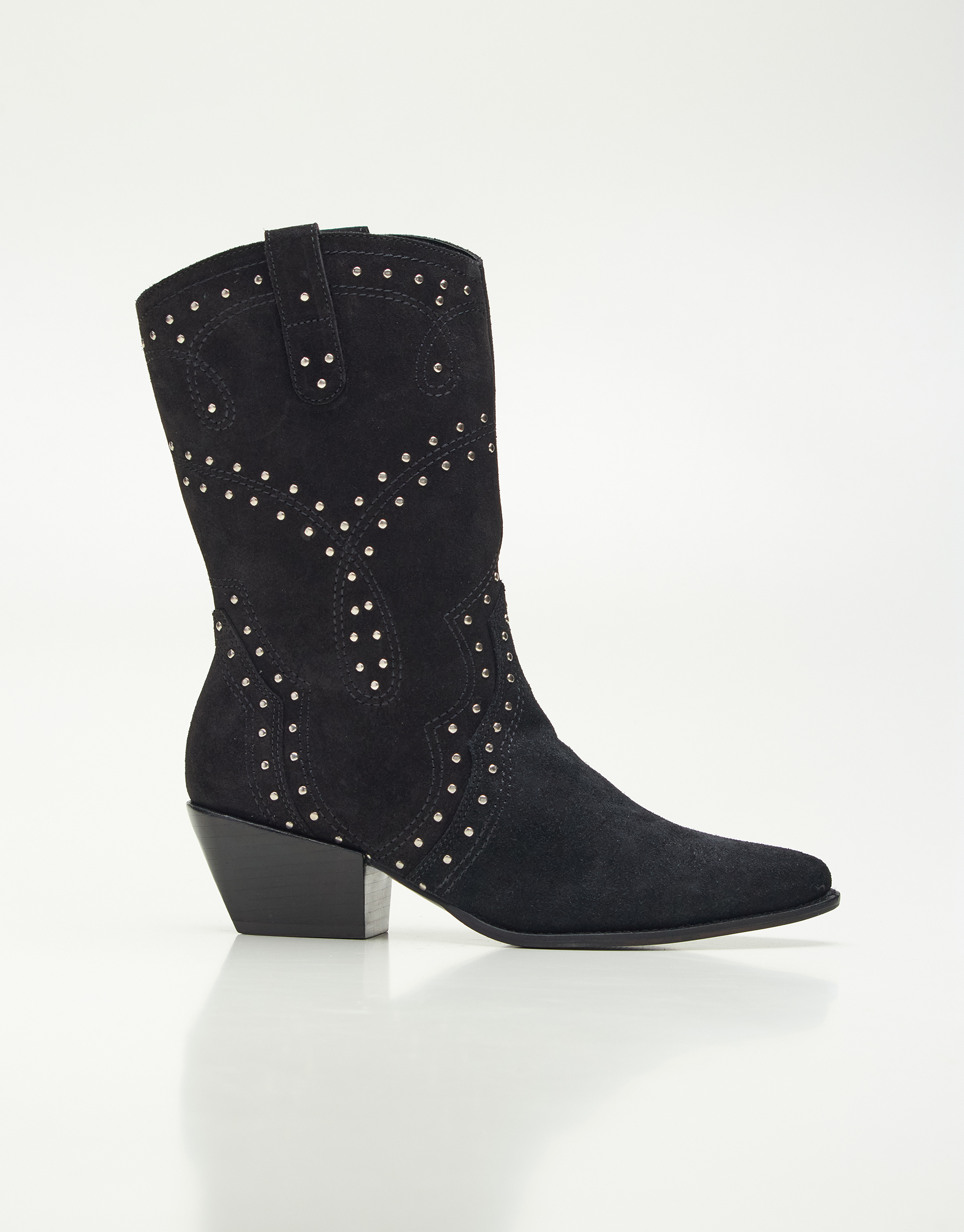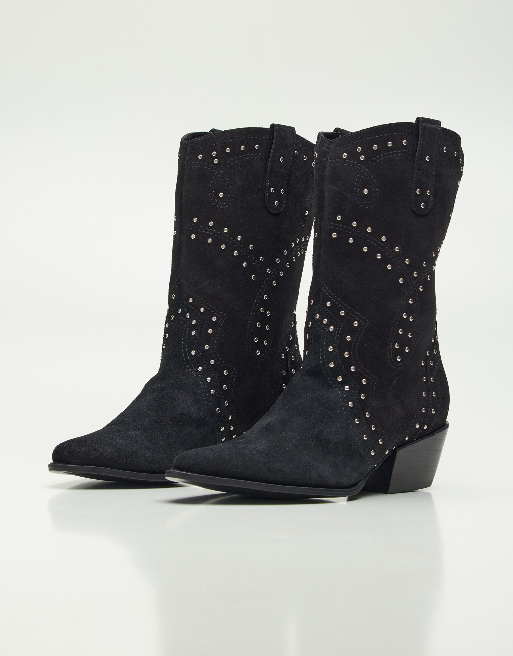 Bota texana media caña de gamuza , detalle de tachas que recorren la caña para darle originalidad a un producto basico . Taco foliado de 5.5 cm , horma en punta , forro textil . Marca Viamo