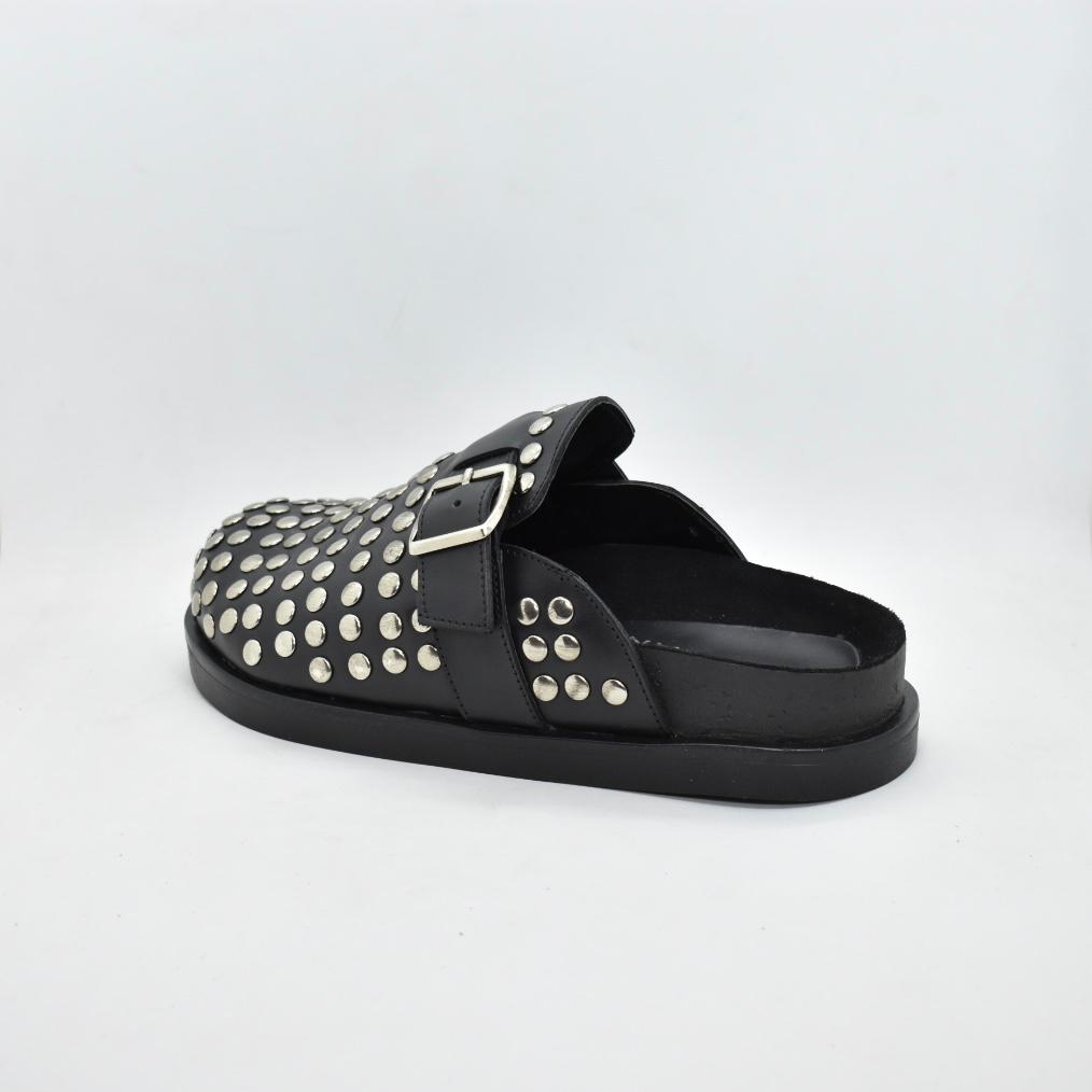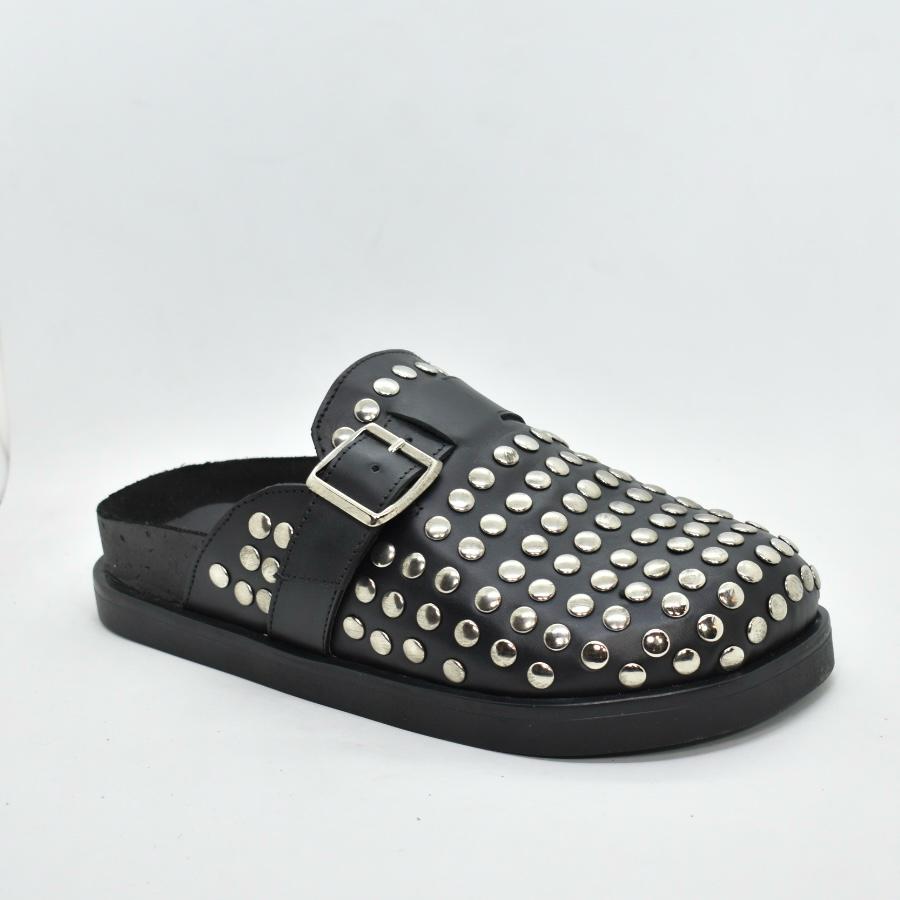 Zueco de cuero negro, con plantilla anatómica y hebilla, capellada con tachas y una base de goma para mayor comodidad. ¡Un zueco canchero que no te puede faltar! Marca ALBANY