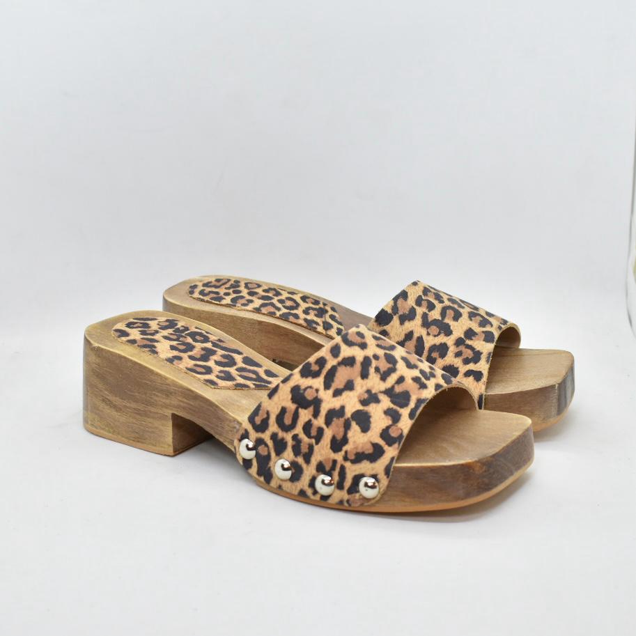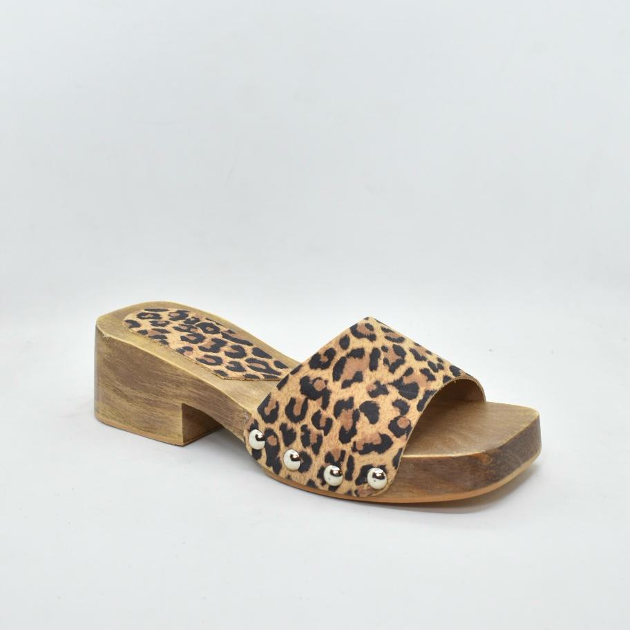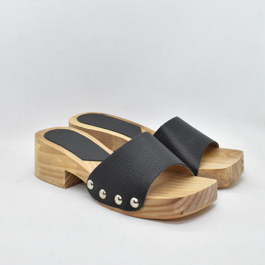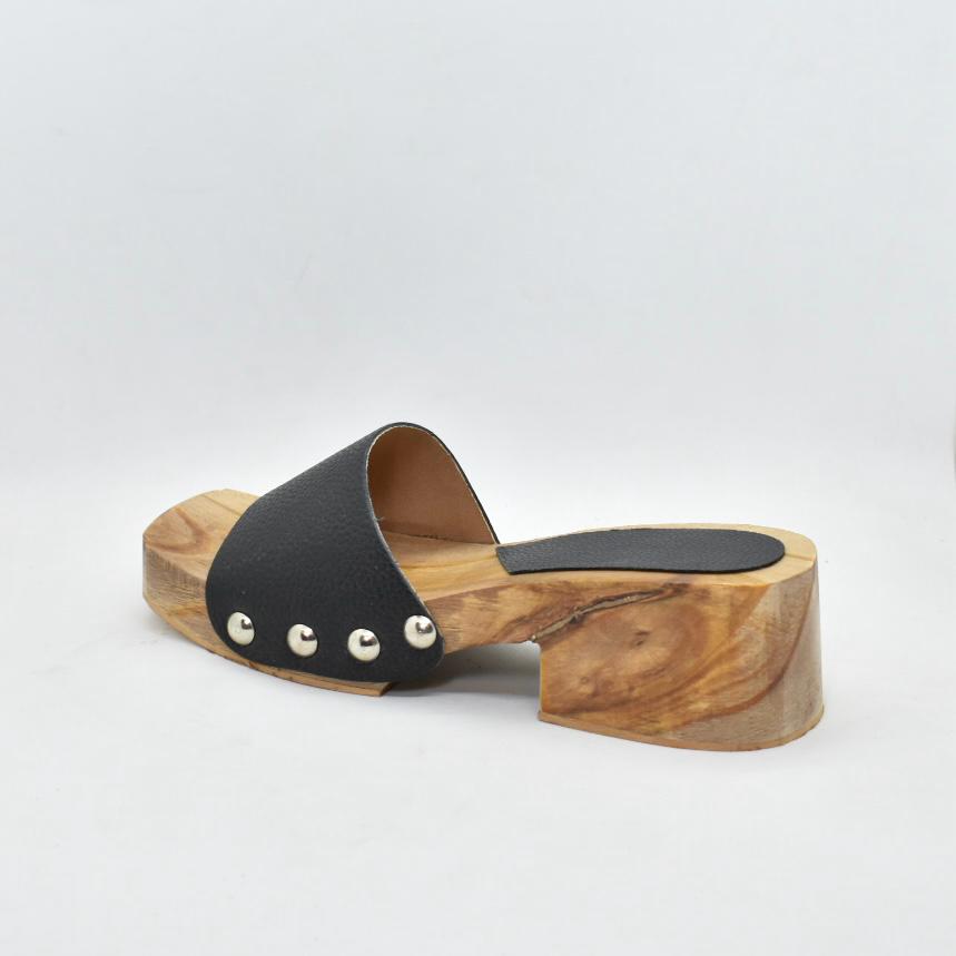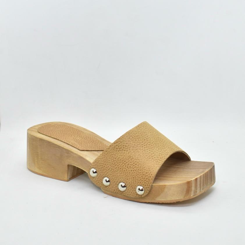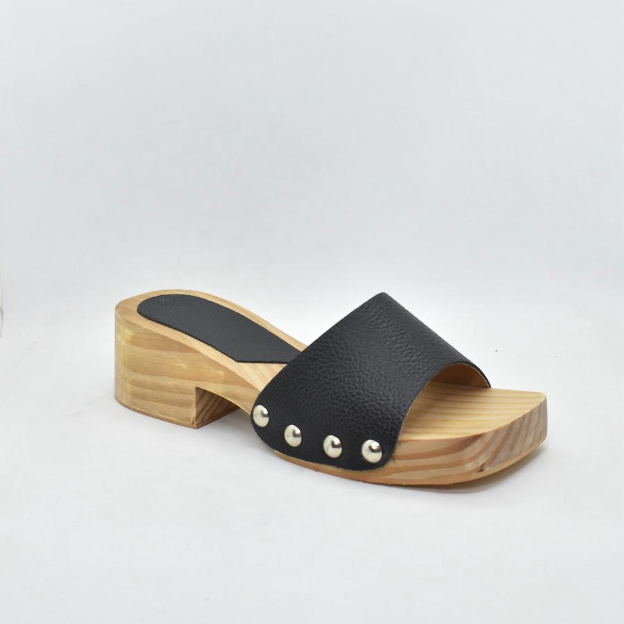Zueco faja de cuero liso , base de madera , detalle de remaches metalizados , altura 5 cm , horma cuadrada . Vuelve un clasico !